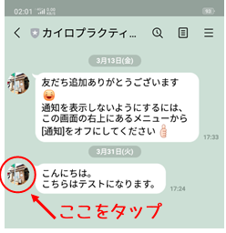 @友達追加して頂いた当院とのチャット画面を開いて頂き、当院のアイコンをタップします。